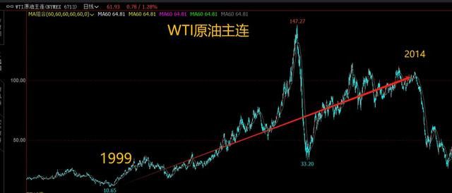 文华商品指数,从76.89点,涨到了最高223.94点,涨幅接近2倍。其中,WTI原油价格,从最低的10美元左右,上涨到最高147美元,直到2014年,油价依然保持在100美元左右的高位。